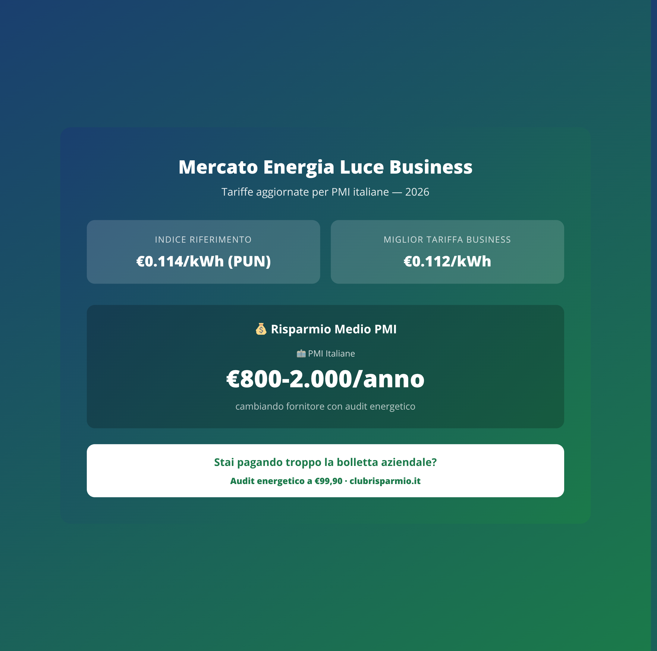 Vuoi scoprire quanto puΓ² risparmiare la tua azienda? Visita clubrisparmio.it e richiedi il tuo audit energetico professionale a soli €99,90 all’anno. I nostri esperti analizzeranno i consumi della tua PMI e ti forniranno una strategia personalizzata per ridurre i costi energetici. Inizia oggi stesso a ottimizzare la gestione energetica della tua impresa.